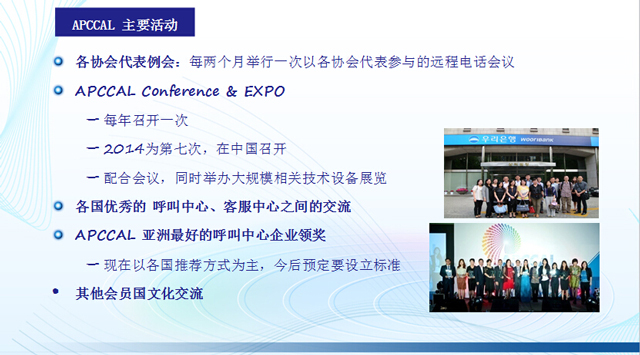 為了亞洲各國的與呼叫中心、客服中心相關(guān)的產(chǎn)業(yè)信息的共享和通過實(shí)質(zhì)性的交流,以更好的相互發(fā)展各會(huì)員國的呼叫中心、客服中心產(chǎn)業(yè)為目的。