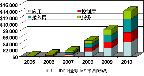IMS作為一個(gè)通信架構(gòu),開創(chuàng)了全新的電信商業(yè)模式,拓展了整個(gè)信息產(chǎn)業(yè)的市場(chǎng)空間。IMS正在成為新一輪的投資熱點(diǎn)。IDC認(rèn)為,IMS市場(chǎng)將從目前的數(shù)百萬美元迅速增長到2010年的141億美元(如圖1)。對(duì)于電信行業(yè)來說,IMS的意義甚至超出了3G或4G,它將重新定義未來的通信業(yè)務(wù)。