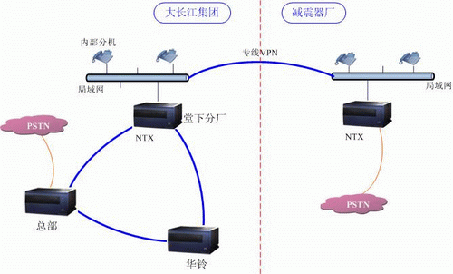 大長(zhǎng)江集團(tuán)采用佳和融合通信系統(tǒng)設(shè)備,組建集團(tuán)的電話通信網(wǎng)絡(luò),并與合作伙伴“減震器廠”也實(shí)現(xiàn)了組網(wǎng),網(wǎng)絡(luò)拓?fù)鋱D如下: