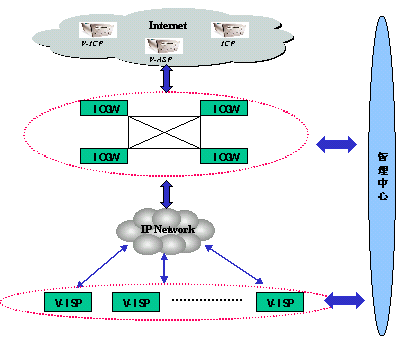 整個語音互聯(lián)網(wǎng)由V-ISP接入服務平臺、ICGW信息控制關口、V-ICP內容提供平臺、管理平臺四部分組成。這四部分分別完成不同的功能。