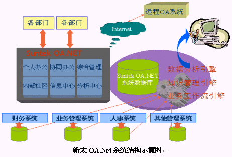 新太OA.NET系統(tǒng)采用B/S結(jié)構(gòu)設(shè)計(jì),系統(tǒng)以提供大量快速靈活的自定義功能以及許多核心平臺(tái)產(chǎn)品,如協(xié)同工作平臺(tái)、通訊平臺(tái)、知識(shí)管理平臺(tái)、信息服務(wù)平臺(tái)等,能夠幫助用戶(hù)快速實(shí)施信息化建設(shè),OA.NET系統(tǒng)的最大特色是實(shí)現(xiàn)"零代碼"維護(hù)功能,系統(tǒng)安裝后,無(wú)需編寫(xiě)任何代碼就可生成各種辦公業(yè)務(wù)應(yīng)用,用戶(hù)只需幾個(gè)小時(shí)的培訓(xùn)就可以使用OA.Net提供的工具進(jìn)行復(fù)雜辦公流程的設(shè)計(jì),并且可以不需要經(jīng)過(guò)任何編碼的改動(dòng),就能輕松適應(yīng)流程變化的新情況。另外,OA.NET強(qiáng)調(diào)對(duì)企業(yè)內(nèi)部知識(shí)的有效管理和有效利用,能夠沉積企業(yè)日常的零散信息,并通過(guò)有序歸類(lèi)的方式使之成為對(duì)企業(yè)有用的知識(shí)。OA.Net還提供了功能強(qiáng)大的個(gè)性化配置功能,每個(gè)員工都可以定制自己的界面風(fēng)格和功能模塊,并且可以自己建立個(gè)人的應(yīng)用環(huán)境,滿(mǎn)足個(gè)人的喜好。OA.Net包含了新太自主開(kāi)發(fā)的業(yè)務(wù)工作流處理引擎,能夠在不用編寫(xiě)代碼的情況集成其他業(yè)務(wù)系統(tǒng),實(shí)現(xiàn)了業(yè)務(wù)系統(tǒng)中的數(shù)據(jù)和辦公流程的完美結(jié)合,使得辦公應(yīng)用系統(tǒng)真正成為企業(yè)內(nèi)部的廣義化辦公門(mén)戶(hù)。