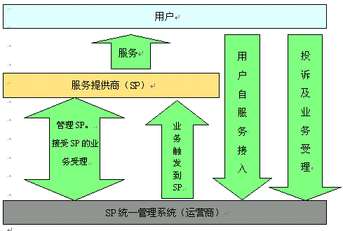 在對SP統(tǒng)一管理的過程中,SP、新太科技、運(yùn)營商、運(yùn)營商用戶組成了一條完整的價(jià)值鏈,如下圖所示: