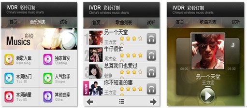 6)彩鈴定制業(yè)務(wù)。傳統(tǒng)彩鈴定制業(yè)務(wù)基于純語音IVR的環(huán)境下使用起來非常繁瑣,進(jìn)行彩鈴檢索比較麻煩,選擇的準(zhǔn)確度也很低。手機客戶端軟件的應(yīng)用,提供了可視化的交互方式,讓業(yè)務(wù)使用起來直觀便捷很多。用戶通過聲動魅力完成彩鈴信息的瀏覽、試聽、定制過程,用戶可以邊瀏歌曲的同時邊聽到語音對歌曲的介紹,并可試用該歌曲。下圖即為彩鈴定制業(yè)務(wù)操作界面: