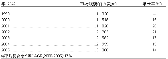 如圖一所示,1999年,美國的固定網(wǎng)OSS服務(wù)保障的市場規(guī)模約為13.2億美元。而在2000年,這一市場比上一年增長了15%,達(dá)到15.18億美元。根據(jù)Frost & Sullivan的預(yù)測,從2000年到2005年間,美國的固定網(wǎng)OSS服務(wù)保障市場的年平均復(fù)合增長率將高達(dá)17%,市場規(guī)模在2005年預(yù)計(jì)會增長至33.66億美元。