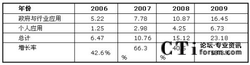 如圖1所示,F(xiàn)rost & Sullivan認(rèn)為,由于個(gè)人應(yīng)用領(lǐng)域的商業(yè)模式還未成熟,產(chǎn)業(yè)鏈整合仍在進(jìn)行中,目前移動位置服務(wù)應(yīng)用仍然以政府和企業(yè)應(yīng)用為主。如圖4所示,2009年個(gè)人應(yīng)用市場規(guī)模為6.73億元,而政府與行業(yè)應(yīng)用市場達(dá)到16.45億元,兩者總計(jì)達(dá)23.18億元,同比去年增長了53.3%。