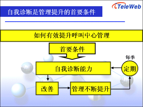 在如何提升呼叫中心運(yùn)營(yíng)管理中,自我診斷是首要步驟。通過(guò)對(duì)現(xiàn)有管理流程的診斷,找出需要改進(jìn)的項(xiàng)目以及空間,從而評(píng)估與呼叫中心整體營(yíng)運(yùn)目標(biāo)是否相符。同時(shí)透過(guò)與整體組織架構(gòu),同業(yè)比較以及標(biāo)準(zhǔn)基準(zhǔn),即可找出需要改進(jìn)的地方。