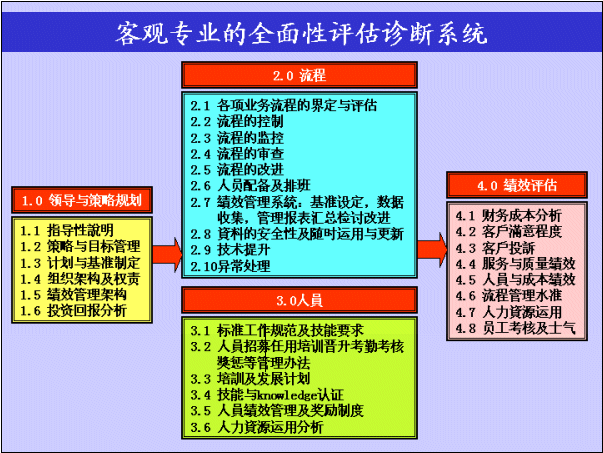 此評(píng)估診斷系統(tǒng)以1.0領(lǐng)導(dǎo)與決策規(guī)劃為起始點(diǎn),作為建立一個(gè)以客戶為核心的高質(zhì)量客戶服務(wù)中心的推動(dòng)根源,并且制定了一個(gè)良好的4.0績(jī)效評(píng)估系統(tǒng),以確保經(jīng)營(yíng)目標(biāo)與標(biāo)準(zhǔn)質(zhì)量基準(zhǔn)能確實(shí)達(dá)成,此過(guò)程需透過(guò)嚴(yán)謹(jǐn)?shù)牧鞒淘O(shè)計(jì)和高效的人員管理去執(zhí)行這套運(yùn)營(yíng)體系。