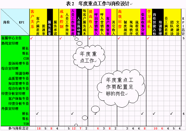 在這里,我們先以崗位設(shè)計(jì)來舉例。經(jīng)常有呼叫中心主管把每個崗位的職責(zé)都設(shè)計(jì)的非常詳細(xì),包括了每天來做什么,說什么,錄入什么,甚至是打掃某區(qū)域衛(wèi)生之類。但是,我看遍了每一條,也沒找到這個崗位應(yīng)該對什么業(yè)績"負(fù)責(zé)任",該對哪些工作做出貢獻(xiàn)。此處建議各位把效益評價(jià)體系、年度重點(diǎn)工作與崗位設(shè)計(jì)結(jié)合起來。如表2所示,我們可以把效益評價(jià)體系作為KPI放在橫坐標(biāo)中,而崗位設(shè)置則是縱坐標(biāo)。每個崗位對應(yīng)的行中,可以勾畫其應(yīng)負(fù)責(zé)或者做出主要貢獻(xiàn)的項(xiàng)目。這些項(xiàng)目不能超過6個,因?yàn)樘嗟捻?xiàng)目會使得這個崗位無所適從,最終的結(jié)果是哪個也沒做好。當(dāng)你勾畫完成之后,請計(jì)算每列的"對勾"數(shù)目,看看你本年度的重點(diǎn)工作是不是有較多崗位負(fù)責(zé)呢?