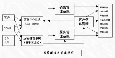 易達CRM在提供客戶信息管理、銷售管理、潛在客戶管理和服務(wù)管理基礎(chǔ)上,還充分集成了低價位的呼叫中心系統(tǒng)(Call center),以及基于IE方式的遠程處理系統(tǒng),其功能框圖如下:
