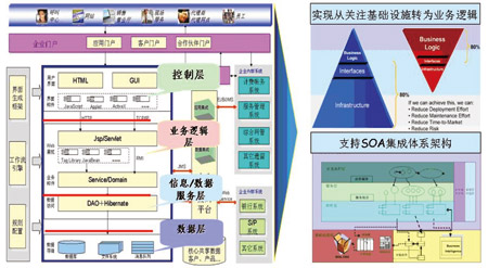 在具體實(shí)現(xiàn)的技術(shù)路線上,產(chǎn)品采用以J2EE為核心的層次化體系結(jié)構(gòu),基于業(yè)務(wù)流程管理和業(yè)務(wù)規(guī)則管理引擎,實(shí)現(xiàn)界面表現(xiàn)層與業(yè)務(wù)邏輯層、業(yè)務(wù)邏輯層與應(yīng)用組件層、應(yīng)用組件層與數(shù)據(jù)訪問(wèn)層、數(shù)據(jù)訪問(wèn)層與數(shù)據(jù)存儲(chǔ)層之間的分離,支持統(tǒng)一的權(quán)限管理和認(rèn)證機(jī)制以及統(tǒng)一的企業(yè)門戶接入。(如圖1所示)