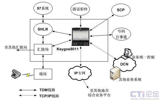 東進(jìn)Keygoe系列多媒體交換機(jī)通過(guò)高密度7號(hào)信令鏈路支持、大容量的時(shí)隙交換、多網(wǎng)絡(luò)接口和語(yǔ)音處理完成不同業(yè)務(wù)系統(tǒng)的7號(hào)信令的接續(xù)和解析、話音交換和協(xié)議轉(zhuǎn)換。對(duì)于已經(jīng)進(jìn)行固網(wǎng)智能改造的電信網(wǎng)絡(luò),可以在匯接局將各種業(yè)務(wù)平臺(tái)連接至東進(jìn)Keygoe系列多媒體交換機(jī),并通過(guò)東進(jìn)Keygoe系列多媒體交換機(jī)連接至SHLR,實(shí)現(xiàn)多業(yè)務(wù)平臺(tái)上的多業(yè)務(wù)觸發(fā),同時(shí)通過(guò)SHLR與97系統(tǒng)以及其他業(yè)務(wù)支撐系統(tǒng)連接起來(lái),實(shí)現(xiàn)業(yè)務(wù)的統(tǒng)一批價(jià)、鑒權(quán)和計(jì)費(fèi);對(duì)于沒(méi)有進(jìn)行固網(wǎng)智能化改造的電信網(wǎng)絡(luò),可以在匯接局通過(guò)東進(jìn)Keygoe系列多媒體交換機(jī)和SSP提供基于TCP/IP層面的業(yè)務(wù)平臺(tái)互聯(lián)。