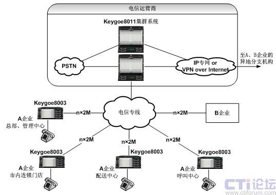 電信運(yùn)營(yíng)商在核心機(jī)房部署由東進(jìn)Keygoe系列多媒體交換機(jī)組成的高性能集群交換機(jī)系統(tǒng),各個(gè)企業(yè)以及各企業(yè)的市內(nèi)分支機(jī)構(gòu)(如管理中心、連鎖門店、配送中心、呼叫中心等)分別配置東進(jìn)Keygoe系列多媒體交換機(jī),并通過(guò)電信運(yùn)營(yíng)企業(yè)的2M專線(E1中繼)方式上聯(lián)到電信運(yùn)營(yíng)商核心機(jī)房的交換機(jī)集群系統(tǒng),組成一個(gè)以集群交換機(jī)系統(tǒng)為核心的星形網(wǎng)絡(luò)(如上圖所示)。所有的市話呼入和呼出都通過(guò)核心節(jié)點(diǎn)和電信運(yùn)營(yíng)商的中繼通道,為連鎖型商業(yè)企業(yè)提供內(nèi)部話音通訊的統(tǒng)一編號(hào)、統(tǒng)一撥號(hào)、統(tǒng)一維護(hù)和管理,企業(yè)對(duì)外公布統(tǒng)一和便于記憶的號(hào)碼,實(shí)現(xiàn)企業(yè)管理、營(yíng)銷和客戶服務(wù)的統(tǒng)一化和規(guī)范化。核心機(jī)房的高性能集群交換機(jī)系統(tǒng)充分考慮冗余備份,如模塊和整機(jī)設(shè)備的雙冗余,從而提高整個(gè)通信平臺(tái)的高可用性和高可靠性。各個(gè)分支的多媒體交換機(jī)具備本地的獨(dú)立工作能力,即使在中繼線路出現(xiàn)故障的情況下,也能正常的工作。同時(shí),Keygoe系列多媒體交換機(jī)集成了7號(hào)信令、會(huì)議、傳真、語(yǔ)音等豐富的多媒體處理資源,可以為用戶開(kāi)發(fā)靈活多樣的智能業(yè)務(wù)和增值業(yè)務(wù),豐富了系統(tǒng)的應(yīng)用。