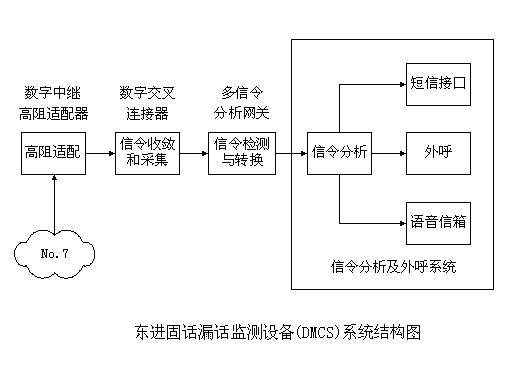 東進(jìn)固話漏話業(yè)務(wù)是通過東進(jìn)漏話監(jiān)測設(shè)備(DMCS)來為固話用戶提供漏話增值服務(wù)的。設(shè)備主要包括:數(shù)字中繼高阻適配器、數(shù)字交叉連接器、多信令分析網(wǎng)關(guān)和信令分析及外呼系統(tǒng)。其功能結(jié)構(gòu)如下圖所示。