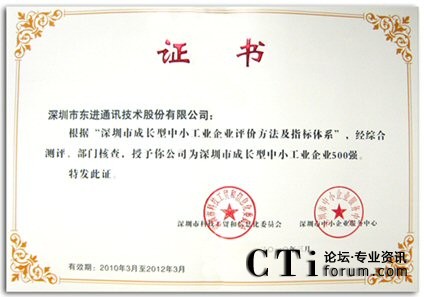 CTI論壇(ctiforum)4月6日消息(記者 潘婷婷):由深圳市政府大力支持,深圳市科工貿(mào)信委、深圳市中小企業(yè)服務(wù)中心,深圳市統(tǒng)計(jì)局,深圳大學(xué)管理學(xué)院聯(lián)合組織評(píng)測(cè)的“深圳市成長型中小工業(yè)企業(yè)500強(qiáng)”,于3月31日被正式認(rèn)定,深圳市東進(jìn)通訊技術(shù)股份有限公司榮列其中。今后,作為深圳市中小企業(yè)成長工程的重點(diǎn)培育對(duì)象,東進(jìn)技術(shù)將獲得政府公共資源的傾斜扶持,促進(jìn)加快發(fā)展,形成“示范效應(yīng)”。