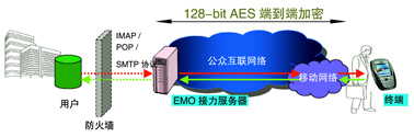 鑒于用戶目前正使用互聯(lián)網(wǎng)郵件系統(tǒng),愛立信提供了EMO Email Push互聯(lián)網(wǎng)版解決方案。方案需要將Email Push應用的用戶在愛立信EMO接力服務器上注冊,同時在用戶的手機上安裝客戶端軟件即可;