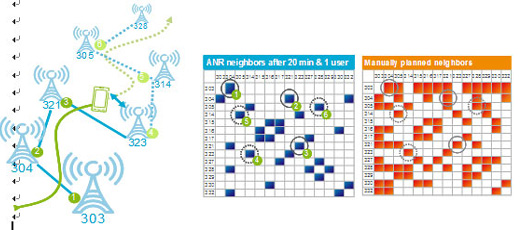 ANR盡管目前在LTE還沒有商用,但在多個歐美運營商的測試中,愛立信產(chǎn)品表現(xiàn)良好。如下圖ANR測試中,僅使用一個移動終端在20分鐘內(nèi)通過了20個基站覆蓋區(qū)域,檢測到的鄰區(qū)關系如藍圖所示,相比橙色圖的手工配置鄰區(qū),所有必要的鄰區(qū)關系(有數(shù)字標示)悉數(shù)獲得。而且這僅僅動用了一個終端,如果相關區(qū)域內(nèi)都有終端分布,檢測的速度會有極大提高。