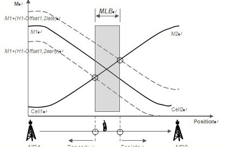 過早、過晚切換是由于目標小區(qū)切換門限過低和過高所致。對應過早和過晚臨界切換門限之間的區(qū)間就是合理的移動性優(yōu)化范圍。頻內(nèi)的負載均衡也可以通過調(diào)整切換門限值來引導用戶和負荷由高負荷小區(qū)遷移至低負荷小區(qū),很顯然可調(diào)的門限區(qū)間就是移動性優(yōu)化允許的范圍。這個范圍對應相鄰小區(qū)的重覆蓋面積,在LTE中理論上大概相當于正常小區(qū)面積的15%,可操作的價值不是很大。愛立信更傾向于異頻或者異系統(tǒng)的負荷均衡方案,增益比較明顯。如下圖,一個終端從左至右移動,M1、M2分別是接收到eNB1和eNB2的信號強度曲線,兩條曲線相交點對應的地理位置處終端接收到的信號強度相同,對cell1到cell2的切換,下面的虛線對應過早切換臨界,上面的虛線對應過晚切換臨界,兩線與M2相交點對應合理切換門限區(qū)間,也是頻內(nèi)負載均衡MLB的可調(diào)范圍。