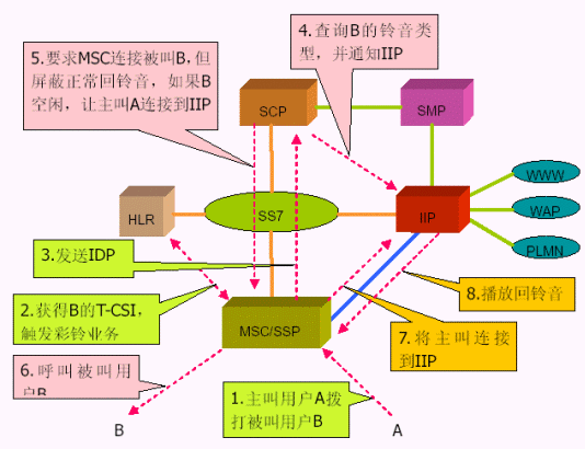 3. 智能網(wǎng)方式使用移動智能網(wǎng)中的信令控制節(jié)點(diǎn)(SCP)實現(xiàn)智能業(yè)務(wù)的業(yè)務(wù)邏輯,新增的智能外設(shè)用于為用戶提供回鈴音和用戶管理功能。 個性化回鈴音業(yè)務(wù)是基于智能網(wǎng)系統(tǒng)的一個新業(yè)務(wù),在智能網(wǎng)中增加新的業(yè)務(wù)控制點(diǎn)(SCP)和獨(dú)立智能外設(shè)(IIP)。為此只需要為此業(yè)務(wù)加入基于Intel平臺的SCP和IP即可,前者是智能網(wǎng)體系中的業(yè)務(wù)控制設(shè)備,用于實現(xiàn)智能業(yè)務(wù)的業(yè)務(wù)邏輯,使用的是Intel高性能的c-PCI平臺,支持高可靠性的冗余備份,提供業(yè)務(wù)呼叫控制和業(yè)務(wù)數(shù)據(jù)維護(hù)功能;后者是智能網(wǎng)獨(dú)立外設(shè),使用的是Inetl Dialogic的相關(guān)語音板卡,用于為個性化回鈴音用戶提供語音(回鈴音)、以及業(yè)務(wù)管理等功能。優(yōu)點(diǎn)是無須改動現(xiàn)網(wǎng)上MSC/SSP 的軟件,通過采用SCP 查詢被叫用戶狀態(tài)的方式,只有當(dāng)被叫用戶處于空閑的情況下,才使用IIP 進(jìn)行處理,可以減少系統(tǒng)負(fù)荷,降低SSP 與IIP 之間話路的占用。缺點(diǎn)是需要MSC支持智能網(wǎng)業(yè)務(wù)。