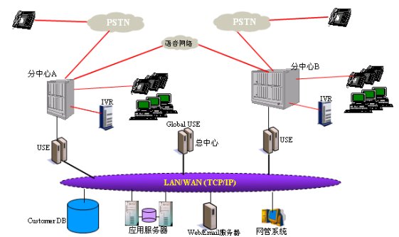 如圖所示,分布式應(yīng)用模式下,各分支節(jié)點(diǎn)的USE負(fù)責(zé)本地的呼叫控制和分配,Global USE負(fù)責(zé)呼叫在不同分支點(diǎn)之間的互專(zhuān)和數(shù)據(jù)控制。