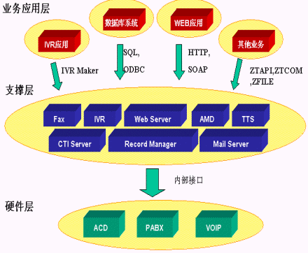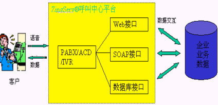 SQL Server,MySQL等多種數(shù)據(jù)庫;通過HTTP調(diào)用第三方WEB程序,通過SOAP協(xié)議調(diào)用Web Server上的服務(wù),從而利用外部應(yīng)用進(jìn)一步加強(qiáng)IVR的功能;用戶只需做一些簡單配置就可以實(shí)現(xiàn)電話訪問數(shù)據(jù)庫、WEB和業(yè)務(wù)系統(tǒng)。如圖所示: