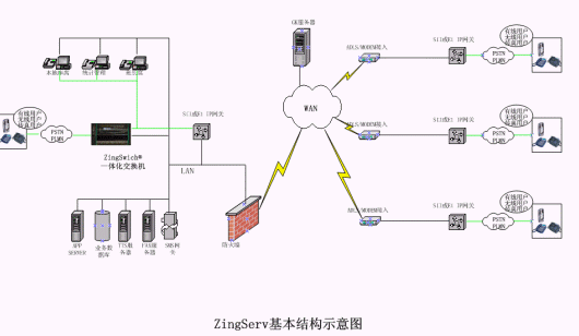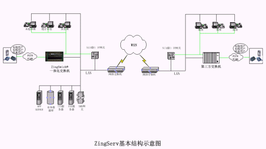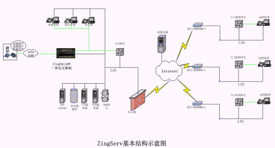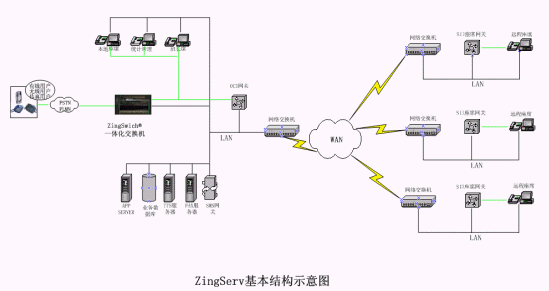 硬件:坐席集中的中心點都有ZingSwitch®交換機,S口網關和CO8卡或E1接口網關和E1卡。VPN動態(tài)注冊服務器和VPN設備,或GK服務器。