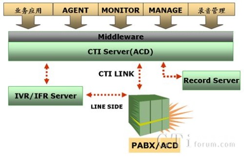 聯(lián)絡(luò)中心主要由電話呼叫分配(PBX/ACD)、計算機(jī)電話集成(CTI)、交互式語音應(yīng)答(IVR)、實時錄音和自動外撥等組成,逐漸形成了一個復(fù)雜的多系統(tǒng)異構(gòu)平臺。