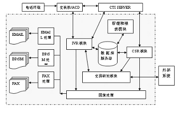 客戶服務(wù)中心系統(tǒng)由智能排隊(duì)機(jī)(含接入服務(wù)器)、核心服務(wù)器CTI、交互式語音應(yīng)答系統(tǒng)IVR、語音傳真服務(wù)器、業(yè)務(wù)服務(wù)器、工作流服務(wù)器、數(shù)據(jù)庫服務(wù)器、Internet/Intranet服務(wù)器、人工座席、尋呼機(jī)接口、手機(jī)短消息接口等組成。