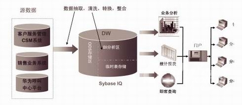 利用Sybase IQ的產(chǎn)品優(yōu)勢(shì),我們將客戶服務(wù)管理系統(tǒng)、銷售業(yè)務(wù)系統(tǒng)、華為呼叫中心平臺(tái)的各種異構(gòu)數(shù)據(jù)庫(kù)數(shù)據(jù),通過 IQ 提供的直接數(shù)據(jù)訪問方式,逐步實(shí)施對(duì)數(shù)據(jù)的抽取、轉(zhuǎn)換及加載(ETL),最終整合到