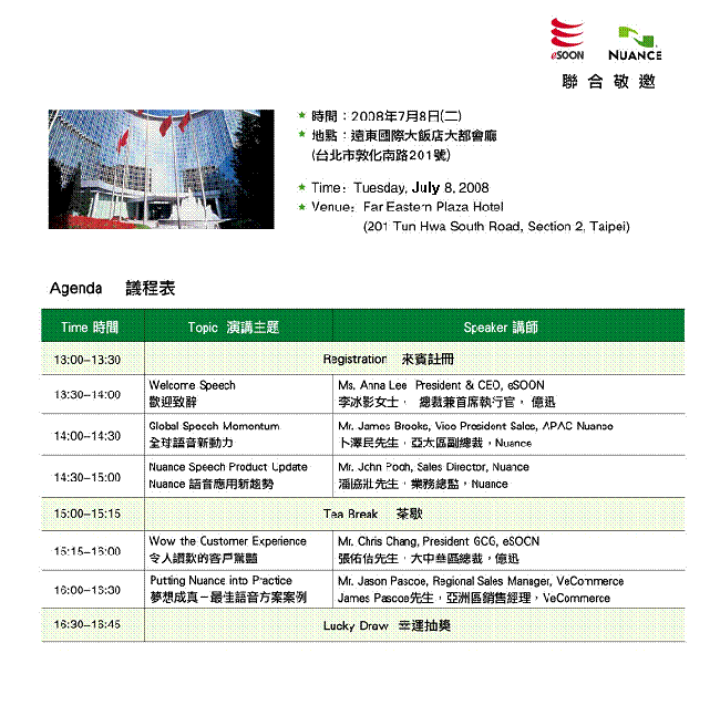 2008“Nuance語音技術(shù)高峰論壇”臺(tái)北站7月8日將于遠(yuǎn)東國際大飯店舉行