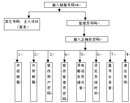 4). 主人密碼:信箱主人訪問(wèn)自己信箱的口令。主人可以通過(guò)訪問(wèn)自已的信箱修改密碼,若主人忘記密碼可通過(guò)管理員將其設(shè)置為缺省值0000。