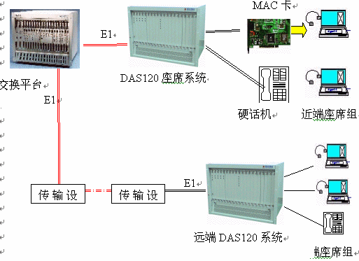 DAS120交換平臺(tái)采用1-4個(gè)E1連接,可以簡(jiǎn)潔實(shí)現(xiàn)PCM信號(hào)轉(zhuǎn)模擬信號(hào)引出到座席。E1接口的信令可選配為隨路信令CAS和透明通道Clear Channel。E1可通過光端機(jī)、微波、HDSL等設(shè)備來(lái)傳輸,從而實(shí)現(xiàn)分布式組網(wǎng)。