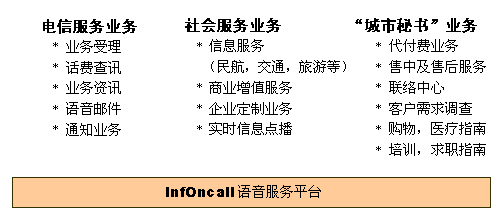 InfOnCall語音服務(wù)平臺應(yīng)用于電信服務(wù)業(yè),能為運(yùn)營商提供相當(dāng)廣的業(yè)務(wù)范圍。
