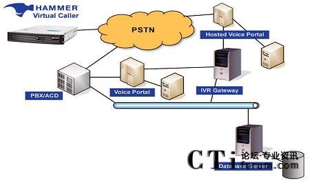 Hammer On-Call IVR測試關注呼叫中心的自助服務技術,以運營商網(wǎng)絡為起點和包括從PSTN接受電話呼叫的PBX/ACD系統(tǒng)、處理電話呼叫的IR(自動應答系統(tǒng))或Voice Portal(語音門戶)、載有面向用戶型業(yè)務的業(yè)務服務器(如VXML)、用于語音激活型業(yè)務的語音識別引擎或者是處理DTMF業(yè)務的DTMF收集器、文本轉換成語音的資源、和用于支持自助服務環(huán)境下運行業(yè)務的所有后臺系統(tǒng)。