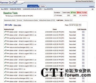 只需使用一個簡單易用的Web接入就可以和Empirix測試小組一起實時跟蹤測試進度。此外,還同時可以查看測試結果、發(fā)生失敗的類型和導致失敗發(fā)生的測試流量。通話全程記錄功能可以用來記錄相關通話,從而捕獲和幫助診斷發(fā)生失敗的根源?梢詤⒖枷铝袌D表: