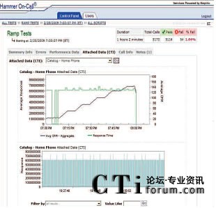 Hammer On-Call IVR測試使用各種各樣的主叫場景模擬真實世界用戶交互。通過改變呼叫量和呼叫場景的混合,Empirix測試專家可以生成指向IVR的模擬真實世界的呼叫流量。此外,在測試中,不同的呼叫測試點上可以使用不同的呼叫率。在測試過程中經常會用到三種基本呼叫模型及其變體;緶y試是使用一個恒定的低呼叫率檢驗被測環(huán)境是否已準備好接受呼叫;增量測試是使用一個固定增量穩(wěn)步增加呼叫量一直到達峰值呼叫量,然后,增加呼叫量直至超過期望值,檢驗系統(tǒng)在峰值時段內是否有額外容量;最后,‘浸透’測試是在指定的時段內使用一個恒定的高呼叫率檢驗系統(tǒng)穩(wěn)定性。