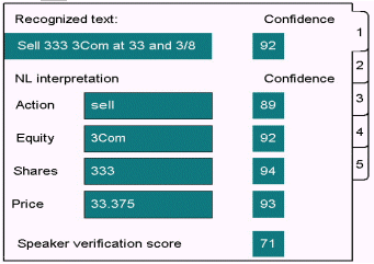 也可使用外部的應(yīng)用知識(shí)內(nèi)容來確定多結(jié)果中的哪一個(gè)是有效的。例如,經(jīng)紀(jì)業(yè)務(wù)應(yīng)用程序,它的用戶投資隨時(shí)間變化而變化。系統(tǒng)可使用簡單的語法來識(shí)別股票證券的名稱。識(shí)別時(shí),系統(tǒng)產(chǎn)生一個(gè)最佳前N個(gè)股票名稱的清單,標(biāo)明假設(shè)的股票證券名稱。應(yīng)用程序然后將每個(gè)清單項(xiàng)目(由最佳到最差)和現(xiàn)有股票證券名稱進(jìn)行比較,從而為該用戶找到可能性最大的一個(gè)。下圖展示的是這些多結(jié)果情況,每個(gè)結(jié)果都可能有它自身的已被識(shí)別的文本、NL解釋和置信度分值。在這一例中,請(qǐng)求了五個(gè)識(shí)別結(jié)果。