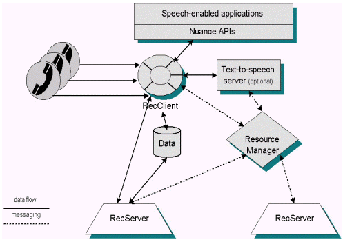 Nuance系統(tǒng)基于開放式客戶/服務(wù)機(jī)結(jié)構(gòu),特別為大型應(yīng)用程序所需的健壯性和可伸縮性而設(shè)計(jì)。呼叫者的講話由客戶端收集,而識(shí)別和鑒別處理的負(fù)載被平均分配到網(wǎng)絡(luò)上的多個(gè)分開的服務(wù)器上。