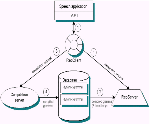 5.當(dāng)RecServer接收到另外的請(qǐng)求時(shí),使用動(dòng)態(tài)語法時(shí)間戳檢查數(shù)據(jù)庫中的語法是否已經(jīng)更新。如果該語法已經(jīng)改變,則RecServer更新其本地副本。否則,它利用緩存的副本處理識(shí)別請(qǐng)求。