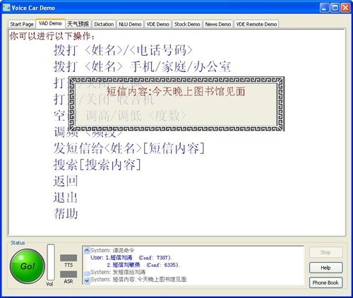 Nuance:可以修改。到你需要修改的那個“見”上,你再說“見”或者見面,它就給你弄過來了。但是我們覺得在中國區(qū),在中文的修改上,這未必可能是個好辦法,我們也在試探另外一種辦法,這個辦法我現(xiàn)在可以給大家介紹一下。就是這樣,我要說修改,那么那個語音合成TS就開始給你再讀,剛才不是讀了一遍嗎,它再給你讀,但是這一次讀,它是一個詞一個詞地讀。他說,今天我不吭聲,晚上,我不吭聲,他說七點,我也不吭聲,等他說“見”的時候,我說“見面”,他知道我說的這個詞要把那個覆蓋掉,再改,再把它改了。這樣可能更合理一些,就是你手不用去摸什么東西,眼睛看什么東西,完全能保持你在駕駛的時候,這是我們目前還在進(jìn)行開發(fā)的一個東西,或許下一次如果我們再有機(jī)會我們就可以把這個演示一下。