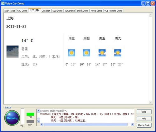 比方說這個關(guān)于空調(diào)問題,我們過去,空調(diào)的命令詞是“把空調(diào)打開,空調(diào)溫度提高3度。”現(xiàn)在我也可以這樣說,空調(diào)調(diào)高一點,我有點冷,也可以。就是你在車?yán)镞呁耆梢杂媚阕约旱恼Z言來說你想干的事。比如說,前邊你不知道明天天氣會怎么樣,人一般都會想想,明天天氣如何,或者是告訴我天氣預(yù)報。但是你也可以這樣說。明天會下雨嗎?也可以這樣說;蛘吣氵@樣說,你說,今天大盤怎么樣。完全是用自然語言來說。堵不堵車,“查詢交通情況!边@就是,實際上可以有各種不同的說法來完成這個任務(wù),這是我們自然語言的一個演示。
