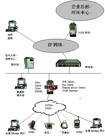 隨著信息技術(shù)的發(fā)展,企業(yè)對通訊的需求越來越多,并越來越呈現(xiàn)多樣性,有語音通訊,傳真通訊,數(shù)據(jù)通訊等。我們拿銀行作為一個(gè)例子來分析,目前我國大多數(shù)大型商業(yè)銀行都在各個(gè)市(甚至縣)建有一個(gè)IVR交互式語音應(yīng)答系統(tǒng)以滿足其客戶的語音查詢需求;同時(shí),系統(tǒng)也要具備傳真通訊功能,以滿足某些大客戶需要傳真回復(fù)確認(rèn)的需求;目前,各個(gè)商業(yè)銀行也建立了自己的企業(yè)銀行平臺(tái),所以中心也需構(gòu)建一個(gè)接入服務(wù)器來滿足某些大客戶的遠(yuǎn)程撥號接入進(jìn)行遠(yuǎn)程交易;隨著Call center 應(yīng)用的興起,各商業(yè)銀行的省行呼叫中心需要將其各市行的語音接入平臺(tái)(IVR),通過VoIP 技術(shù),接入到省行的Call Center 中心,從而建立一個(gè)分布式的Call Center,以提高對其客戶服務(wù)的滿意度 。
