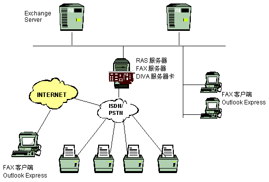 終端設(shè)備:FAX Client(也可以用OUTLOOK 98/EXPRESS)主要是對FAX Mail進(jìn)行再處理, 比如可以指定到可用的打印機或傳真機打印等。