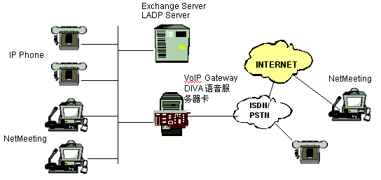 電話呼叫。在這種情況下,多于一個的電話連接可以同時在IP線路上通過數(shù)據(jù)包來傳送。通過使用G.723.1將語音進(jìn)行壓縮,傳送一路話音所需的帶寬將從64kbps(ISDN線路)減少到5.3kbps.如果在廣域連接中沒有足夠的帶寬或者廣域連接因為某些因原而中斷,我們?nèi)匀贿可以使用原來的PSTN來呼叫遠(yuǎn)端的辦公室。這就意味著用戶可以使用原來的服務(wù)方式而不僅僅只依賴于IP連接。所以,DIVA語音服務(wù)器的實施將通過提供附加的,低費用的電話呼