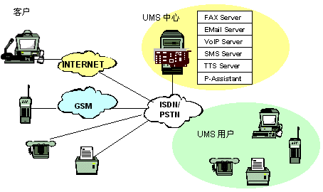 客戶用電子郵件、語音、尋呼、移動短消息、傳真等與UMS用戶聯(lián)系,UMS中心啟動相應(yīng)的服務(wù)與客戶建立連接,將客戶所發(fā)信息按識別標(biāo)識直接轉(zhuǎn)發(fā)到UMS用戶或中繼服務(wù)器,若因UMS用戶不在等原因,無法直接聯(lián)系,系統(tǒng)會提示客戶選擇別的方式聯(lián)系。也可將其存儲,并進(jìn)行必要的格式轉(zhuǎn)換與管理,這時UMS中心可以主動呼叫UMS用戶的手機,傳真機,電話等主動將信息送到,UMS用戶也可以在任何時間、任何地點,從固定電話網(wǎng)(普通電話、傳真機、IC卡電話等)、移動網(wǎng)(GSM、模擬、CDMA、WAP手機、掌上電腦、PDA等)、尋呼網(wǎng)、互聯(lián)網(wǎng)(PC)訪問中心服務(wù)器查詢,索取個人信息。