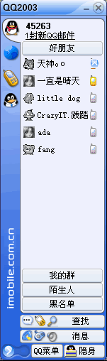 從主界面來看,MSN Messenger 6.0基本沒有改變,而QQ2003則新增加了QQ短信和QQ游戲兩個按紐,同時增加了QQ郵件提示,這和MSN Messenger的電子郵件提示非常類似。