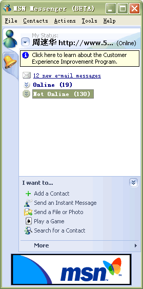 5月26日,微軟最新即時通訊軟件MSN Messenger的最新版本MSN Messenger Beta 6.0.0250被提前遭遇外泄,使得大家提前領略到了微軟最新的即時通訊軟件風采。這也是微軟.net計劃中的一個重要組成部分,也讓我們看到了一些微軟“格林威治(Greenwich)”的影子!案窳滞(Greenwich)”――是微軟基于.net戰(zhàn)略的能夠?qū)崟r進行通信等的服務器軟件的開發(fā)代號。由于未對外正式發(fā)布,此次公開的是MSN Messenger Beta 6.0英文版本,并沒有簡體中文的版本。