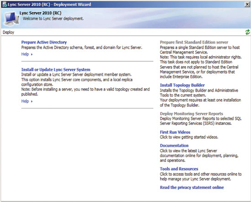 準(zhǔn)備好基礎(chǔ)結(jié)構(gòu)并發(fā)布拓?fù)浜,即可開始安裝前端服務(wù)器和服務(wù)器角色,以啟用 A/V 會議、企業(yè)語音、監(jiān)控、存檔及其他功能。準(zhǔn)備每臺服務(wù)器從運行部署向?qū)В▍⒁妶D 3)開始,但每個服務(wù)器角色都有自己的安裝和配置要求。您可以在 TechNet 庫的“部署 Lync Server 2010 Standard Edition”部分查找更多詳細信息。