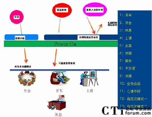 智能應(yīng)答業(yè)務(wù)是針對(duì)消費(fèi)者不便通話時(shí)的一個(gè)增值業(yè)務(wù)。當(dāng)被叫用戶有來電時(shí),因?yàn)樽约旱脑虿槐阃ㄔ挾鴴鞌嚯娫捄笸ㄟ^手機(jī)彈出的菜單,供用戶選擇與對(duì)方進(jìn)行的后續(xù)溝通。被叫用戶可以根據(jù)所處的情況選擇對(duì)應(yīng)的情景,系統(tǒng)將根據(jù)用戶選擇的情景對(duì)應(yīng)給主叫用戶發(fā)送短信和放音。智能應(yīng)答業(yè)務(wù)給了我們禮貌拒接的機(jī)會(huì)。當(dāng)您正在會(huì)議室里和客戶如火如荼的策劃下個(gè)項(xiàng)目,當(dāng)然不想被其他人打擾。突然有個(gè)電話打了進(jìn)來,接還是不接,不接有可能是一個(gè)潛在的客戶,接了又是對(duì)目前工作的一種打斷。如果你辦理了智能應(yīng)答業(yè)務(wù),當(dāng)你掛斷電話的同時(shí)手機(jī)上將出現(xiàn)一個(gè)菜單,你可以根據(jù)當(dāng)前具體情況選擇目前所處的情景(開車、開會(huì)、上課……等)。如你選擇了某種情景,系統(tǒng)將根據(jù)用戶選擇的情景,給主叫用戶播放相應(yīng)的語(yǔ)音通知(如:“您撥叫的用戶正在開會(huì),請(qǐng)稍后再撥”)。