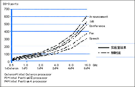 圖1顯示了主要的通信媒體處理功能的實驗測量結果和預期性能。Intel 編制的HMP軟件,在Intel的從566 MHz 到 2 GHz的Celeron和 Pentium 處理器上,已經對語音宣告、IVR和會議算法完成了實現(xiàn)、優(yōu)化和測試。圖1中的實線表示實驗室中的測試結果。Intel的目標是實現(xiàn)這些算法,并擴展到更高速的Intel Pentium處理器,雙路、四路、甚至八路Intel Pentium處理器、Intel Xeon處理器以及Intel Itanium處理器。圖1中的虛線顯示了Intel所期望的在未來的實現(xiàn)中將得到的結果。目前,HMP的版本主要以Windows為主,很快就會推出Linux版本。從根本上說,HMP最適合用在純IP的環(huán)境,也可通過擴展到多個服務器實現(xiàn)密度的提升。