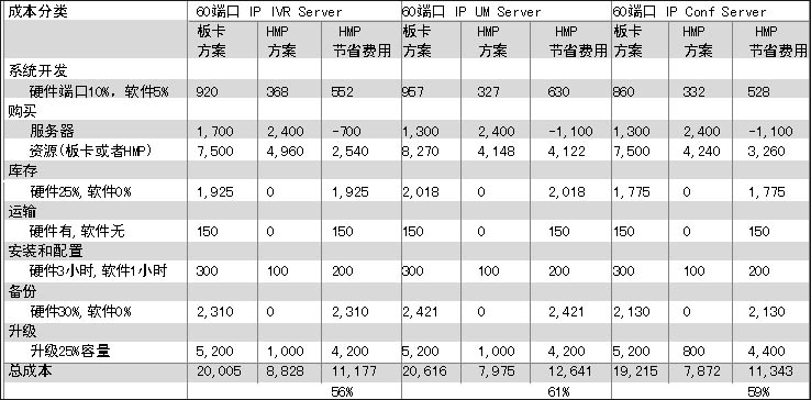 在眾多好處當中,對用戶最有吸引力的無疑是節(jié)省成本。張怡國特別強調,對一個應用系統(tǒng)而言,成本的計算不應該單以產品端口購買價格考核,而應該是系統(tǒng)總的建設成本,包括產品購買成本、服務器成本、運輸、安裝、庫存、升級等多項費用;贖MP1.1版本,張怡國作了一個比較,以60端口IP IVR 60、端口IP UM或者60路會議為例,和語音板卡處理方式相比,基于HMP軟件實現(xiàn)能有近60%的成本節(jié)省,其中采購能節(jié)省20%,庫存節(jié)省20%,備份節(jié)省20%,升級節(jié)省近40%。